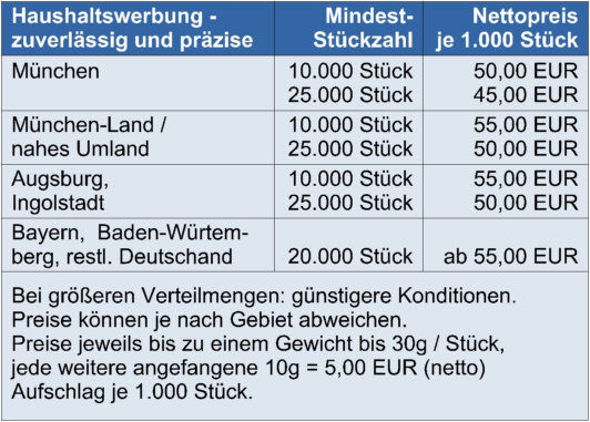 Bei der Prospekt- und Flyer-Verteilung konzentrieren wir uns auf Bayern, sind aber in der Lage deutschlandweit und im nahen Ausland kurzfristig und ebenfalls zu günstigen Konditionen zu agieren.